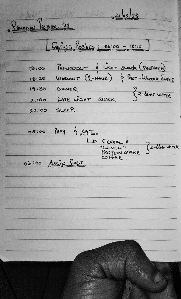 I had a few things to consider when formulating this plan: training with heavy weights and then fasting for 12 hours sounds like hell, training on a fasted stomach is exhausting and dangerous, not being able to drink water while training is a no-no, also staying at a caloric surplus and staying hydrated are key parts to maintaining my muscle mass.